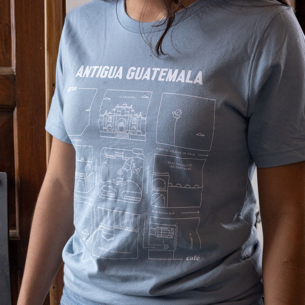 Una tshirt que ilustra el mapa de los alrededores del centro de Antigua.
